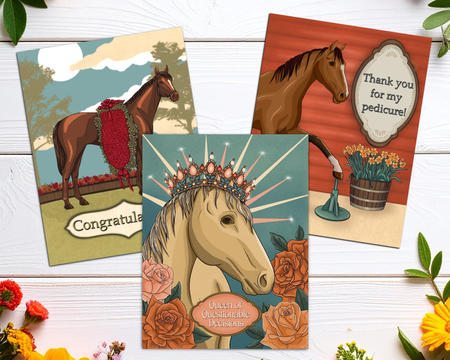 Our line of equestrian greeting cards combine charming design and horsey humor that is sure to speak to your equine loving customers. Artist created designs that can only be found here at The Moody Mare Market!